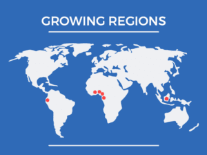 Cocoa grows in tropical regions around the world. West Africa (mostly Ivory Coast,